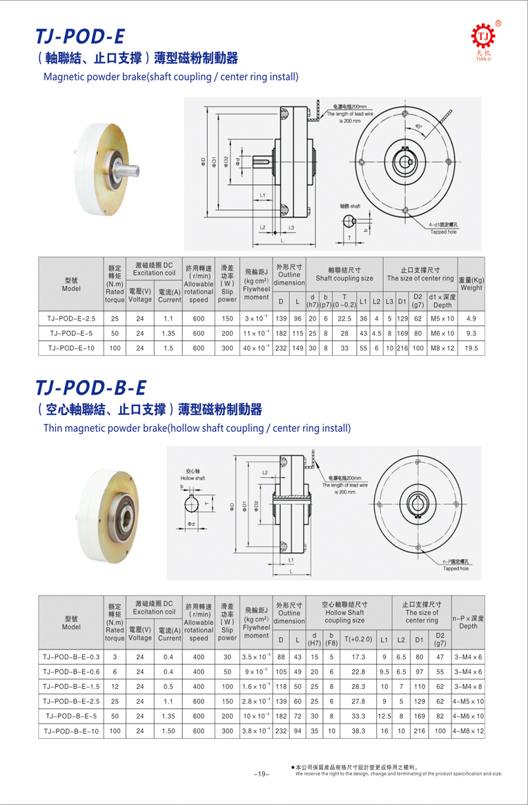 東莞天機(jī)傳動(dòng)廠家生產(chǎn)的空心軸薄型磁粉剎車器又稱止口支撐薄型磁粉剎車器,額定轉(zhuǎn)矩:3-100N.m;額定電壓:DC24V;激磁線圈電流:0.4-1.5A。適用于放卷張力控制,磁粉剎車器還經(jīng)常被用于傳動(dòng)機(jī)械的測(cè)功加載和制動(dòng)等。