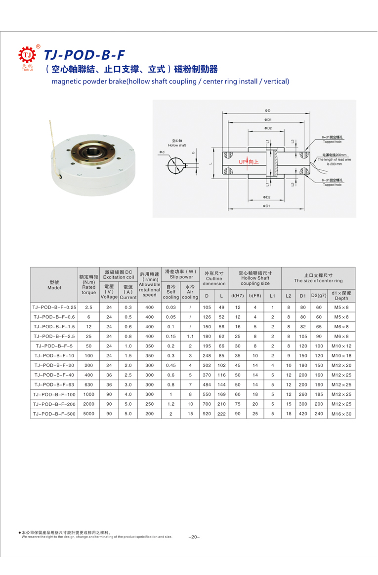 東莞天機(jī)傳動廠家生產(chǎn)的空心軸磁粉剎車器又稱立式磁粉剎車器是磁粉制動器中的一種。空心軸磁粉剎車器價(jià)格分為:TJ-POD-B-F、TJ-POD-B、TJ-POD-A、TJ-POD-B-E。這幾種型號的磁粉剎車器都為空心軸連接,立式止口支撐,使用的DC24V安全電壓。