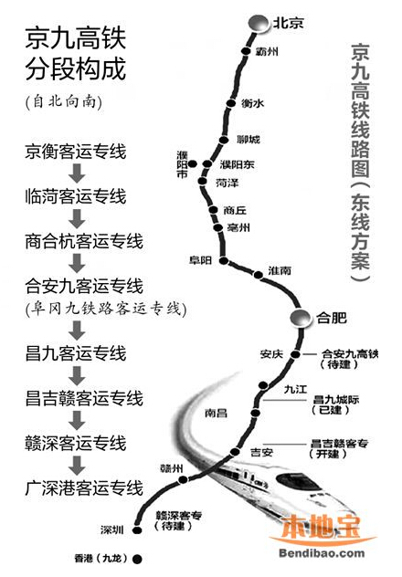 京九高鐵又稱京九客運(yùn)專線,線路全長(zhǎng)2000公里,設(shè)計(jì)時(shí)速為350公里,北起北京,跨越京、冀、魯、豫、皖、贛、粵七個(gè)省級(jí)行政區(qū),南至深圳,連接香港九龍,是連接環(huán)渤海和珠三角的重要高速鐵路干線。途徑北京、霸州、任丘、河間、衡水、清河(邢臺(tái))、臨清、聊城、臺(tái)前(濮陽)、梁山(濟(jì)寧)、菏澤、商丘、亳州、阜陽、淮南、合肥、安慶、九江、南昌、吉安、贛州、河源、惠州、深圳,最后到達(dá)香港九龍。主要由北京至衡水客專(京霸段預(yù)計(jì)2019年建成)、臨菏客專(臨清—菏澤)、商合杭高鐵(商丘到合肥段已經(jīng)建設(shè))、合安九客運(yùn)專線(阜陽到九江段),昌九客運(yùn)專線(九江—南昌)、昌贛客運(yùn)專線(南昌—贛州)和贛深客運(yùn)專線(贛州—深圳)和廣深港客運(yùn)專線(深圳—九龍)接駁而成。京九高鐵商丘以南段將先期建成通車,待北京到商丘段的規(guī)劃建設(shè)完成,京九高鐵將逐步形成。本專題將為您介紹2015京九高鐵最新消息和京九高鐵通車時(shí)間,幫助您了解最新資訊,方便你的出行。