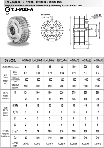 內(nèi)旋轉(zhuǎn)空心軸磁粉制動(dòng)器的規(guī)格有:TJ-POD-A-0.6、TJ-POD-A-1.5、