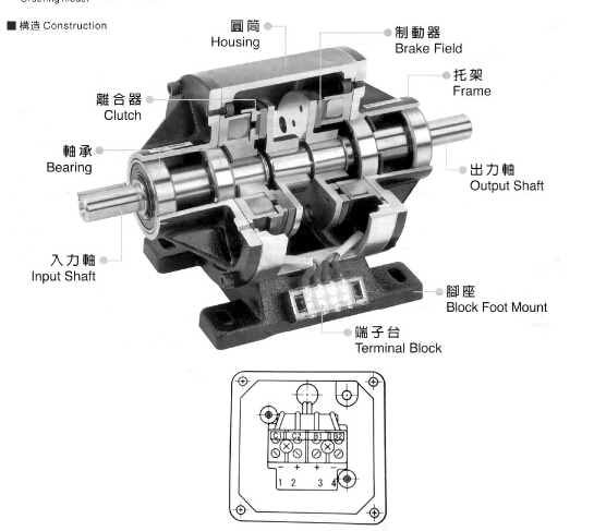 其之電樞與電磁剎車(chē)器則在同軸而形成的出力軸,電磁離合器之軛與電磁剎車(chē)器裝置于機(jī)架上。