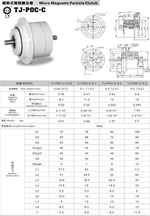 小型磁粉離合器即是微型磁粉離合器,TJ-POC-C型的扭矩比較小,常用的扭矩規(guī)格有0.5Nm、1Nm、2Nm和5Nm共4個(gè)規(guī)格,適合與張力控制器匹配使用。散熱方式為自然冷卻式,5r/min起供應(yīng),最高轉(zhuǎn)速1800r/min。