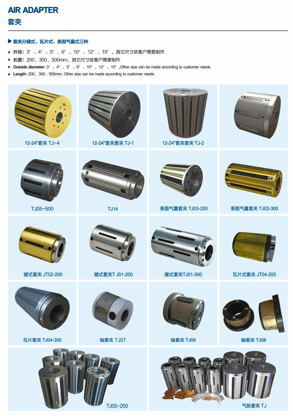 鋁合金板條式氣脹套夾,鋼制瓦片式氣脹套夾產(chǎn)品規(guī)格:分為鍵式氣脹套和板式氣脹套。常用規(guī)格有:3寸轉(zhuǎn)6寸、3寸轉(zhuǎn)8寸、3寸轉(zhuǎn)10寸、3寸轉(zhuǎn)12寸。充氣后直徑漲8mm。長(zhǎng)度有200毫米,250毫米,300毫米,400毫米,500毫米等。 (可根據(jù)客戶需求訂長(zhǎng)短,長(zhǎng)短不限)